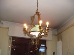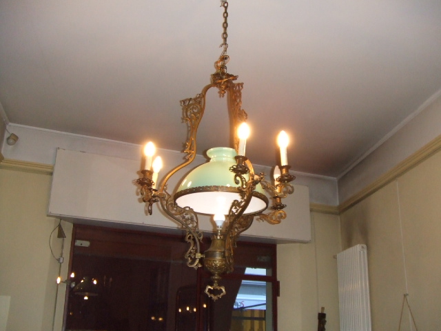 Lucerna Liberty 6 luci in ottone e vetro colorato,inizio XX secolo
